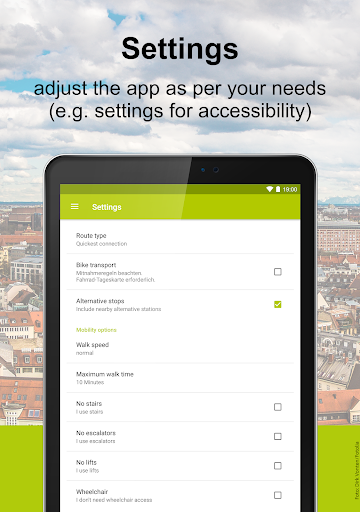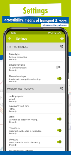 • Mga Setting: Kung pinili mo ang naaangkop na mga setting, maaari mong halimbawa na maiwasan ang mga hagdan sa panahon ng iyong paglalakbay o mas gusto ang oras ng paglalakad sa ibabaw ng Pinakamabilis na koneksyon. Kung sakaling kumuha ka ng bisikleta sa iyo, ang shourner planner ay maaaring gawin ito sa account din. Maaari mo ring ibukod ang mga koneksyon na hindi isinama sa loob ng taripa ng MVV.
