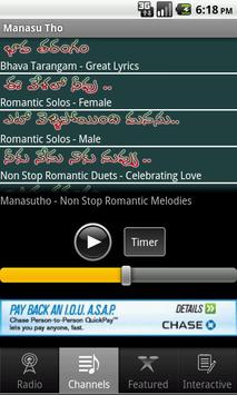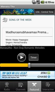 Timer for the Radio or Channels keeps track of time played and will turn off the Music when it expires. You can sleep or relax to the melodious tunes of Manasu Tho songs !