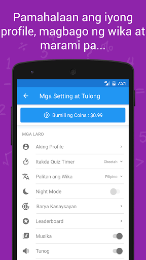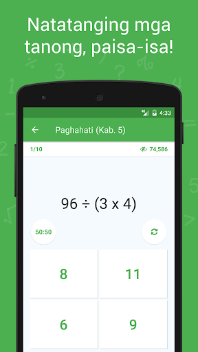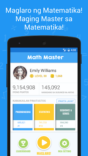 Ikaw ba ay isang estudyante at nais mapabuti ang iyong mga kasanayan sa matematika upang magkaroon ng mas mataas na marka sa pagsusulit? Nais mo bang magkaroon ng mga astig na pagsusulit na laro sa matematika para sa iyong mga anak? O ikaw ay isang eksperto sa matematika at naghahanap ng laro para sa ehersisyo sa isip upang mapabuti ang iyong matematika araw-araw? Nasa tamang lugar ka. Ang Math Master ay isang libreng pagsusulit na laro sa matematika na dinisenyo para sa lahat ng edad! Nag-aalok ito ng isang hanay ng mapaghamong mga pagsusulit para sa bawat matematika at aritmetikang operasyon. Pumili ng anumang libro, simulan ang paglalaro at pataasin ang antas ng iyong game profile. Lutasin ang mga problema sa matematika at maging Math Master!
