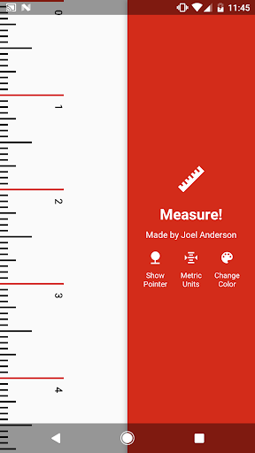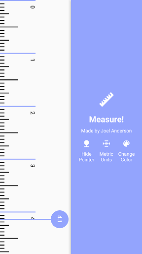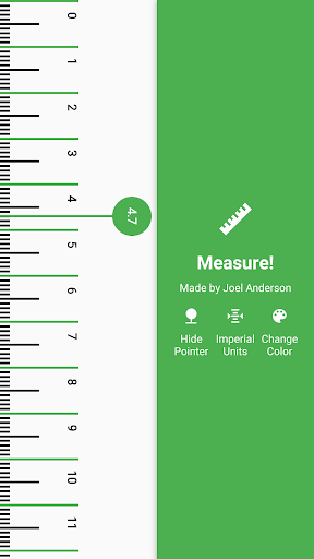 Ang isang simpleng disenyo ng materyal na inspirasyon ng ruler application na may mga yunit ng panukat, mga imperyal na yunit, at isang interactive pointer.