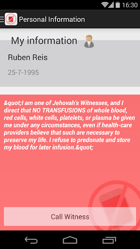 A program to help Jehovah's Witnesses on emergency situations. It provides multiple information on the device to alert the founder of his treatment will, as to the use of blood.