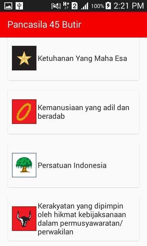 Disini tempatnya Aplikasi TOP gratis terbaik. 10,000+ Pengguna mendownload Pancasila 45 Butir versi terbaru di 9Apps secara gratis! Dengan menggunakan ini, kamu jadi tambah pintar. Aplikasi HOT ini di rilis tanggal 2016-01-27. Download dan gunakan pada HP Android anda!