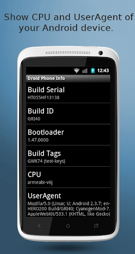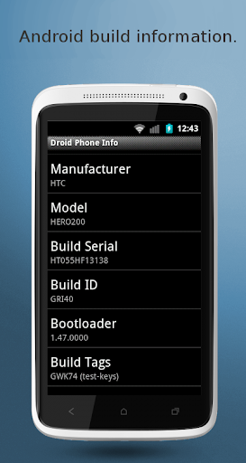 Phone Info shows you all of the device network, software, and hardware information about your Android phone or tablet device. See the build serial, IMSI, IMEI, MEID, MCC, MNC, and more.