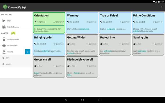 Practicing SQL should also be hassle-free and (yes!) fun. With Knowledify, you will play the role of a freshly hired employee. Through a series of assignments more and more complex around the new database system that you new employer has deployed, you will move up within the company and become masterful in the art of SQL.