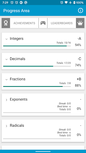 keeps track of progress made in the Practice Area, Achievements, and Leaderboards. It displays the total questions answered, the total correct, percentage correct, assigned letter grade, fastest average time, longest streak, and current streak for many topics. You can also use this area to go directly to a Topic's Practice Area.