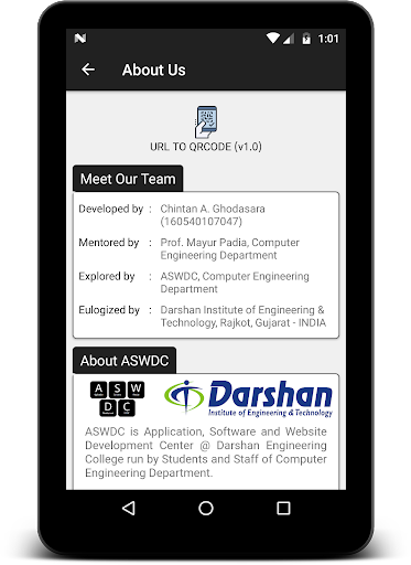 Ang app na ito ay binuo sa ASWDC ni Chintan Ghodasara (160540107047), isang mag-aaral na ika-6-semester ng departamento ng computer engineering.Ang ASWDC ay mga app, software, at sentro ng pag -unlad ng website @ Darshan University, Rajkot na pinapatakbo ng mga mag -aaral at amp;Mga kawani ng Computer Science and Engineering Department.