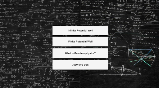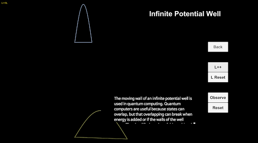 This app has two "physics" sections, infinite potential wells and finite potential walls, and two sections for explaining the "concept" behind quantum mechanics in general. Each of the two main sections have two subsections. Infinite potential wells have two functionalities, increasing the frequency of the electron and increasing the length of the well. The former depicts the different states an electron could be in, and the probability that it can be found in a certain location. The latter depicts what can happen to an electron when the "well" that it is in goes under a sudden change. Finite potential walls also have two functionalities, when the wave has a greater energy than the potential wall, and when the potential wall has a greater energy than the energy of the wave. In the former situation, the reflection and transmission waves both are sine graphs. In the latter situation, the reflection wave is still a sine graph, but the transmission wave is a decreasing exponential graph. From the two sections that explain the "concept" of quantum physics, "What is Quantum Physics?"