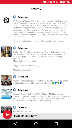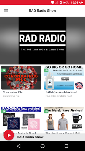 I-stream ang RAD show 24/7 sa aming libreng app!Sa aming live show weekdays mula 5 am-10am Pacific at tumatakbo ang pinakamahusay na mga clip at replays ng mga araw na iyon ay nagpapakita sa hapon.Sumali sa Web site ng pagiging miyembro sa mga miyembro.radradio.com.
