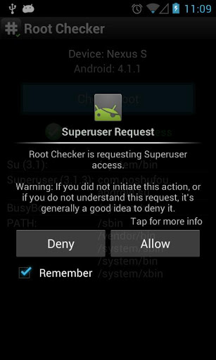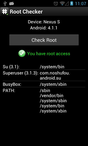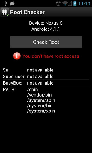 This app checks if your phone has root access. You can see information about: device and Android version, Superuser, BusyBox and Environment variables. It will check and verify the Su binary located on your device. Checks User and Group Id. The test confirms proper permissions and flags on the Su binary.
