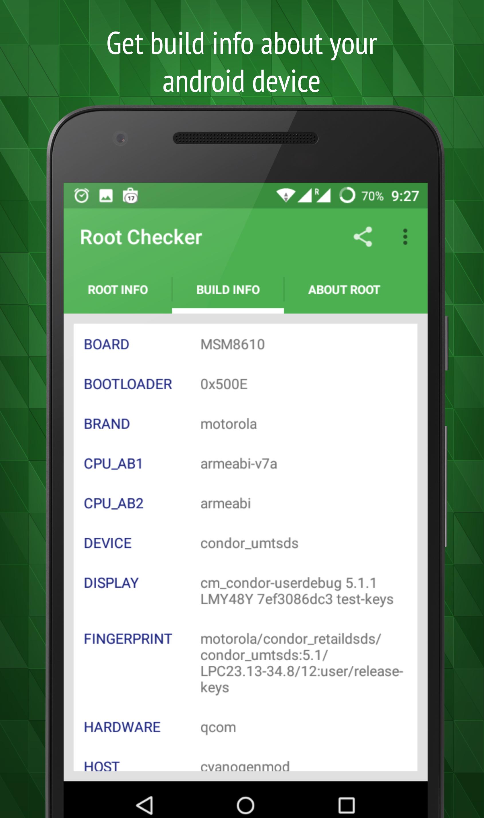 Paglalarawan ng Root Checker & Build Info