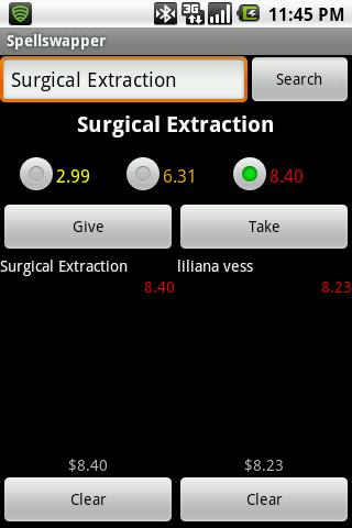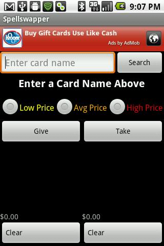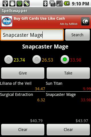 Keep track of the values of cards you39;re trading to someone and the cards you39;re getting from someone.Spellswapper has a list for each trader and cards being traded. The user has the choice of the low, average or high price of the card which can be added to either list.Prices are marked by color: Low prices are yellow, average prices are orange and high prices are red.When a card is added to a trade list, the price39;s color is retained in the trade list to show which price is being used for the trade.As each card is added to the list, the trade39;s total value is recalculated and displayed at the bottom of the list.To retrieve a card39;s prices, enter the name of the card in the search textbox at the top and press the Search button.MAKE SURE YOU ENTER THE ENTIRE NAME OF THE CARD AND ENTER IT CORRECTLY OR YOU WILL NOT GET ANY RESULTS.You can also easily add the set the card is from by pressing and holding on the Search textbox, selecting quot;Insert Set Namequot; from the menu followed by selecting the set from the next menu.This helps if prices vary for a card that39;s been reprinted across different sets.You can remove a card from a trade list by clicking on it and confirming that you want to remove it in the dialog box that appears.You can clear an entire trade list by clicking the Clear button at the bottom of the list.