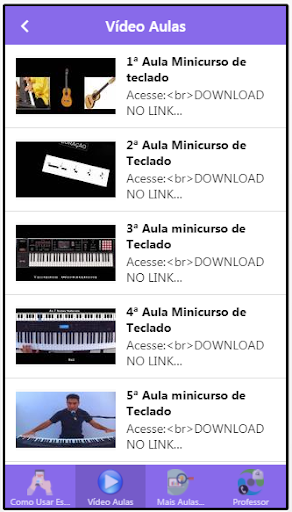 Gamit ang application na ito magkakaroon ka ng access sa mga klase ng video keyboard na magpapakita sa iyo mula sa zero upang matuto ng mga simpleng kanta.Ang mga ito ay mga guro sa pagtuturo ng video kung saan matututunan mo ang tungkol sa paglalaro ng keyboard nang walang komplikasyon at walang burukrasya.Didactic classes na diretso sa punto, sundin lamang ang hakbang-hakbang at simulan ang paglalaro ng keyboard ngayon.Sa kasalukuyan ang paghahanap ng mga klase sa keyboard ay naging napaka-access sa internet, ang tanong ay kung paano magsimula mula sa simula?Ang materyal na ito ay nilikha na may maraming pag-ibig at upang ituro sa iyo ang mga pangunahing kaalaman bukod sa pagtulong sa mga taong gustong matutong maglaro ng keyboard.