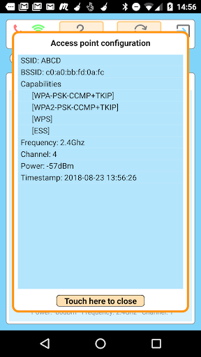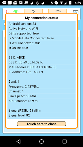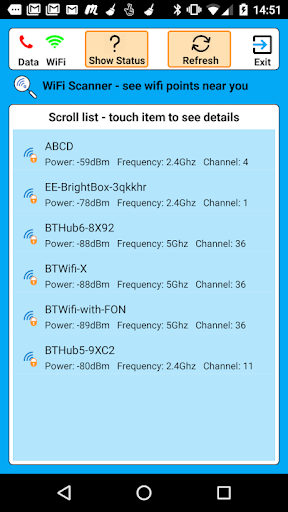 I-scan ng WiFi Scanner ang iyong kalapit na kapaligiran para sa anumang magagamit na mga koneksyon sa WiFi, at ilista ang mga ito.Sa pamamagitan ng pagpindot sa isang item maaari mong makuha ang detalyadong mga setting ng pagsasaayos nito.Makakakita ka rin ng mga detalye ng iyong kasalukuyang data ng mobile at koneksyon sa WiFi.