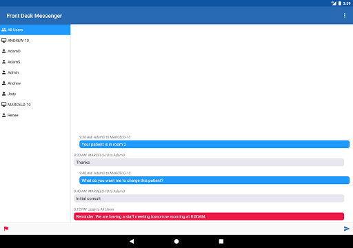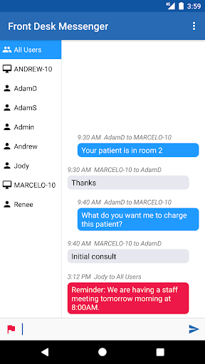 Front Desk Messenger is an office messaging system integrated in the Front Desk - Practice Management System. This Android version allows you to use your compatible Phone or Tablet device to join the Front Desk Messenger conversations between staff and practitioners when either in or out of the office.