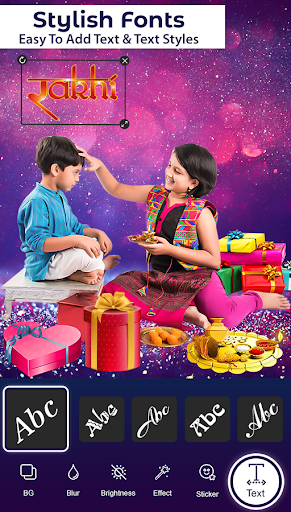Raksha Bandhan photo editor has 20 stickers. Add photo stickers from the sticker collections. Select any sticker drag it to right position, zoom in or zoom out, rotate it, flip it and set it at the suitable position on the photo. You can reduce the opacity of stickers and photos also.