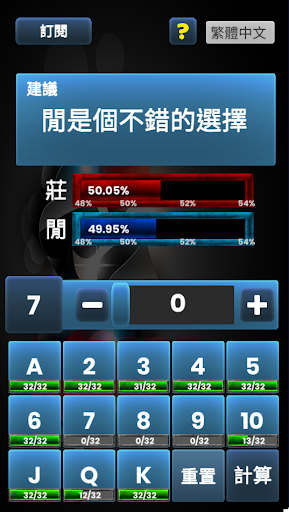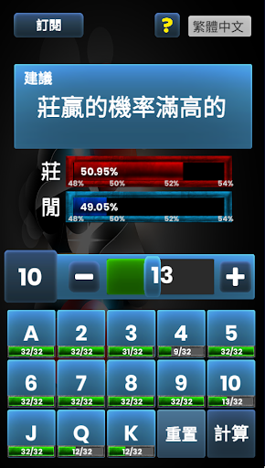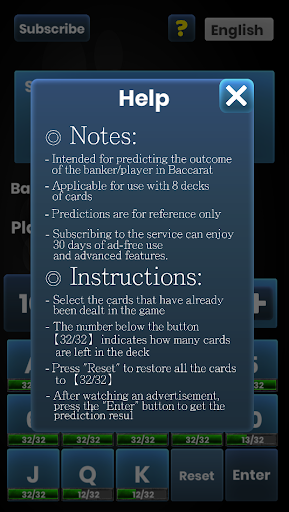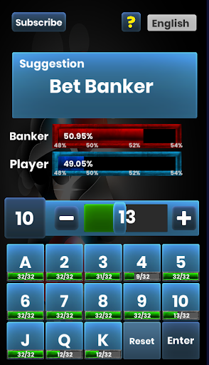 upang magamit ito, simplengPindutin ang kaukulang pindutan pagkatapos ng dealer ay nakitungo sa mga kard.Pagkatapos ay bibilangin ng programa ang natitirang mga kard at kalkulahin ang kanilang epekto sa posibilidad ng tagabangko o manlalaro, na nagpapakita ng isang intuitive na rekomendasyon kung aling panig ang magtaya.Sa pamamagitan ng isang bayad na subscription, ang mga gumagamit ay maaaring tamasahin ang mas tumpak na mga rekomendasyon at inirerekomenda ang mga diskarte sa pagtaya sa pagtaya.