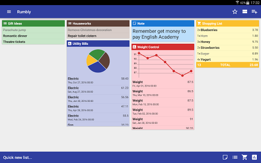 "Rumbly: lahat, Task List Widget" ay isang application para sa mga mobile platform, telepono at tablet na may Android operating system. Ito ay isang pangkalahatang layunin ng application upang pamahalaan ang mga listahan o mga tala.