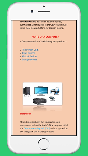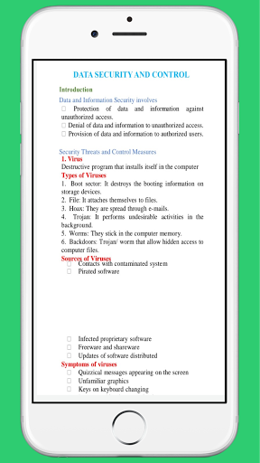 Nagtatampok ang app ng mga sumusunod na paksa Panimula sa mga computer. Mga sistema ng computer "Mga operating system Mga package ng computer. networking seguridad at kontrol ng data at mga tanong sa pagbabago