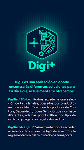 Digi es la aplicación que te permite acceder a diferentes tipos de servicio disponibles en tu ciudad, desde tu teléfono celular. Podrás encontrar servicio de taxi básico y de lujo, reglamentado por el ministerio de transporte, y próximamente servicios adicionales para que tengas más tiempo disponible para ti.