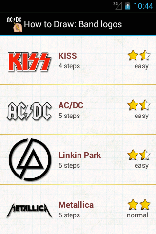 Fun and easy way to learn how to draw from Band logos! Try yourself or teach your friends.Each drawing divided in 05 to 10 steps, and its easy to follow.Have fun with this lessons at home, in school, on paper chalk on asphalt - do it everywhere!★★★ 20 drawing lessons ★★★In our application you will find lessons that will teach you how to draw:✓ Guns N’ Roses✓ HIM✓ Nirvana✓ Aerothmith✓ The Rolling Stones✓ KISS✓ AC/DC✓ Linkin Park✓ Metallica✓ tool ✓ Stratovarius✓ Megadeth✓ Prince✓ The All-American Rejects✓ One Direction✓ Blink-182✓ Pink Floyd Dark Side of the Moon✓ Radiohead✓ The Doors✓ SlayerLearn how to draw and improve your skill in no time with the help of our simple android application. Whether you're an art teacher, art student, or just a hobbyist artist you will find the step by step education that will give you the ability to bring those images in your mind into paper reality.Being a kid or a novice artist can sometimes get discouraging because of the lack of skills one has when they are in this artistic stage. Learning how to draw in a very simple manner is the best way to advance your skills to becoming a better artist. It doesn't matter if you are thirteen, or thirty, there is a lot of concepts you can tackle as you browse our program There is one thing that is certain, you will definitely become a better artist just by tackling the lessons you find here. So go ahead and try and draw, because no matter what you choose to do, you are guaranteed to achieve your artistic goals. Have fun everyone!Short review of bands whoos logos you will draw in our application:★ AerothmithMembers - Steven Tyler, Tom Hamilton, Joey Kramer, Joe Perry, Brad Whitford, Past members, Ray Tabano, Jimmy Crespo, Rick DufaySongs - Dream On, Mama Kin, Same Old Song and DanceSeasons of Wither, Sweet EmotionWalk This Way, Big Ten Inch Record, Last child Back in the Saddle, Draw the Line, Kings and Queens, Come Together★ NirvanaMembers - Kurt Cobain, Krist Novoselic, Dave Grohl, Aaron Burckhard, Dale Crover, Dave Foster, Chad Channing, Jason Everman, Dan PetersSongs - Smells Like Teen Spirit, In Bloom, Lithium, Come as You Are, Breed★ AC/DCMembers - Angus Young, Malcolm Young, Phil Rudd, Cliff Williams, Brian JohnsonSongs - Back in Black, Thunderstruck, Highway to Hell, T.N.T., Shoot to Thrill★ HIMMembers -Ville Valo, Mikko Lindstrom, Mikko Paananen, Mika Karppinen, Janne Puurtinen.Songs - Wicked Game, The Funeral of Hearts, Love Metal, Right Here in My Arms, Gone With the Sin, Strange World★ Guns N’ RosesMembers - Axl Rose, Dizzy Reed, Tommy Stinson, Chris Pitman, Richard Fortus, Ron "Bumblefoot", ThalFrank Ferrer, DJ Ashba.Songs - Sweet Child O' Mine, November Rain, Welcome to the Jungle, Paradise City, knockin' on heaven's door.★ Blink-182.Members - Mark Hoppus, Tom DeLonge, Travis Barker.Songs - All the Small Things, Beautiful Game, I Miss You, First Date,Take off Your Pants and Jacket, What's My Age Again, Enema of the State, Dammit.