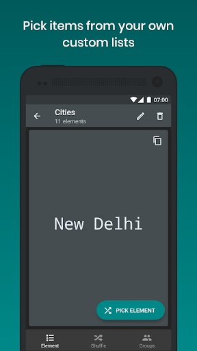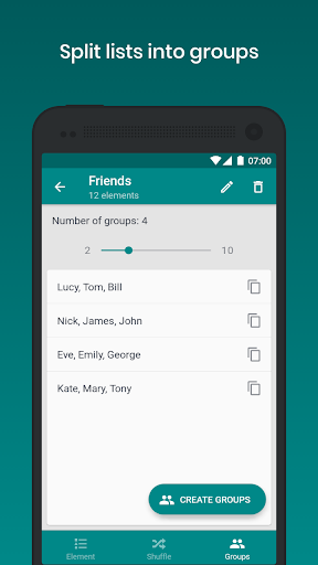 - Pumili ng mga random na elementoMula sa iyong sariling mga pasadyang listahan, hatiin ang mga ito sa mga grupo o i-shuffle ang mga ito.Ang lahat ng mga listahan ay naka-save sa iyong aparato.