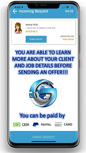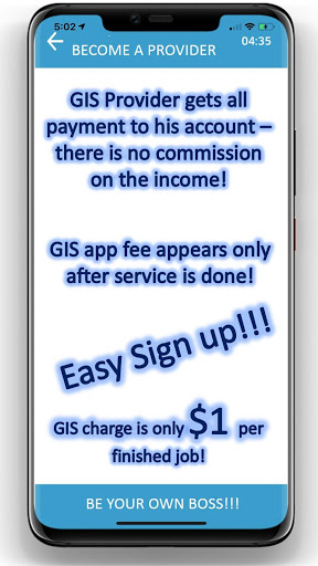 Kapag nakakuha ka ng isang abiso tungkol sa isang kahilingan sa customer makakakuha ka ng isang paglalarawan tungkol sa trabaho na kailangang gawin, ang ilan ay maaaring mag-upload ng mga larawan. Nasa iyo na tanggapin ito o tanggihan ito, walang ganap na presyur sa anumang oras. Gumagana ka sa iyong sariling mga termino. Bilang isang provider maaari mong pumili ng isang paraan ng singil, at ang iyong sariling rate. Ang GIS PRO app ay sisingilin lamang ng bayad sa pagtanggap na $ 1.00 kahit gaano ka kumita. Kung ang trabaho ay tinanggap, kakailanganin itong tapos na o maaaring bumaba ang marka ng iyong rating. Ito ay talagang madali, ang kailangan mo lang gawin, ay subukan ito.