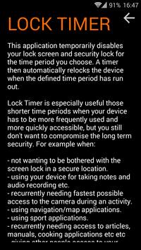 Lock Timer temporarily disables your lock screen and security lock for the time period you choose. A timer then automatically relocks the device when the defined time period has run out.