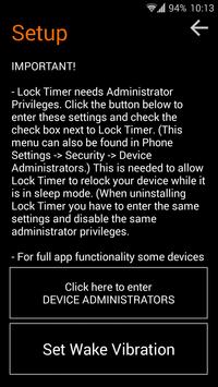 - Lock Timer needs Administrator Privileges to be able to relock your device while it is in sleep mode.(A link to to the Device Administrators page in phone settings will be shown at first run.) When uninstalling Lock Timer you have to disable the same administrator privileges.