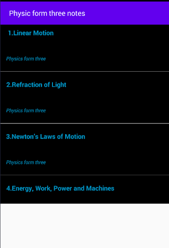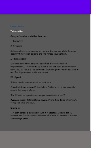 This application contains the following topics -Linear motion -gas laws -newton's laws of motion -Electrostatics two -current electricity -refraction of light -quantity of heat -Energy