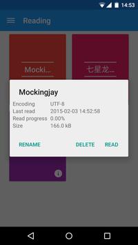 This text reader simplifies the way you read a TXT file by implementing only essential settings, which in turn will put your focus on the main purpose of the app - reading. Each TXT file in read is automatically paged to make you feel like you are reading a book.