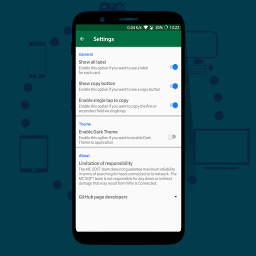 The MC SOFT team does not guarantee maximum reliability in terms of searching for hosts connected to its own network. The MC SOFT team is not responsible for any direct or indirect damage that may result from "Who is connected".