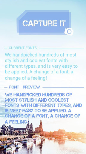 Capture It allows all users to change the system font of your phone or tablet 👌. Supported for devices which have FlipFont™ (Samsung Galaxy S3, S4, S5, Note, Note Ⅱ, Note Ⅲ) to change fonts perfectly or root access. This is absolutely the best installer FlipFont for android!