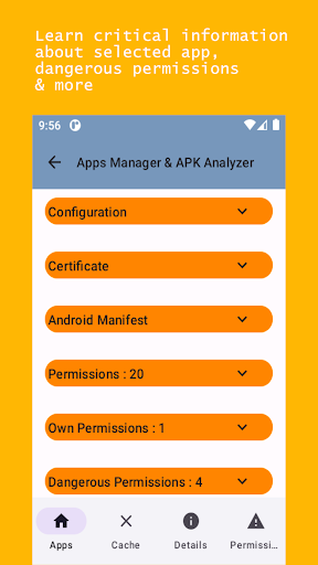 ⭐ Impormasyon sa App: Ang APK Analyzer ay isang magaan at mahusay na app, maaari mong mabilis na mai -scan ang lahat ng mga app na kasama ang nakatago o naka -install na mga app, pag -access ng mga setting ng app at baguhin ang mga pahintulot, malinaw na cache, alamin kung anong mga pahintulot ang ginagamit, simulan ang app & amp;higit pa.✅