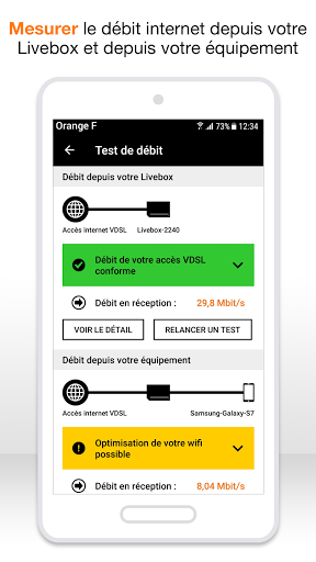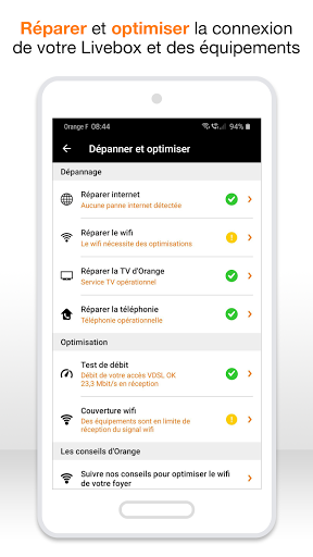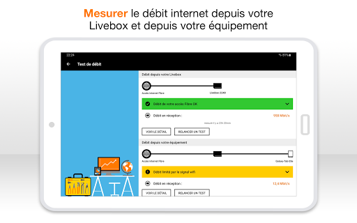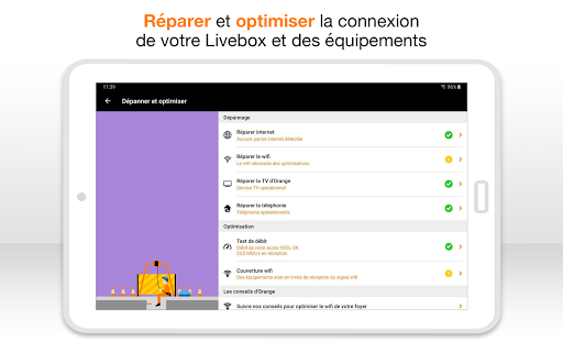 • Tulong sa paglutas ng problema sa pamamagitan ng pagsasagawa ng mga simpleng pagkilos, hindi nangangailangan ng mga teknikal na kasanayan • Kung ang mga pagsubok ay nakakakita ng kabiguan, ang Ang application ay magpapanukala sa iyo upang palitan ang iyong depektibo LiveBox, mag-trigger ng interbensyon ng tekniko upang ayusin ang iyong linya