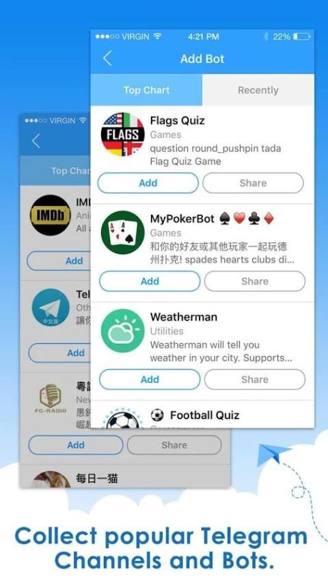 Bots that cover life, entertainment and news such as Weatherman, PokerBot, Soccer Quiz, Horoscope...make your life in telegram far more interesting.