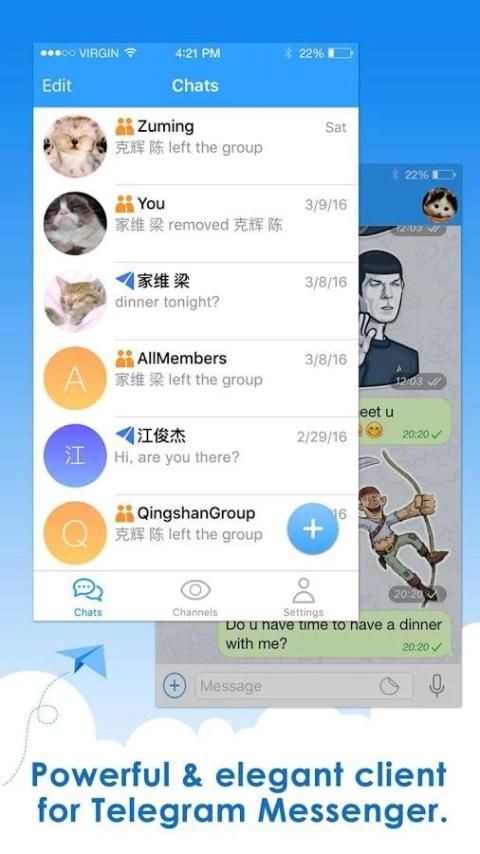 Telepal ( former Teleplus ) is the best unofficial Telegram Messenger client, highly promoting the user experience especially for following features:
