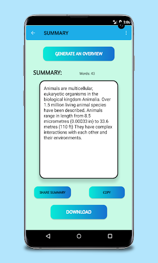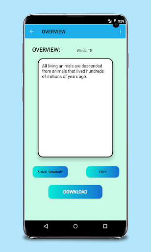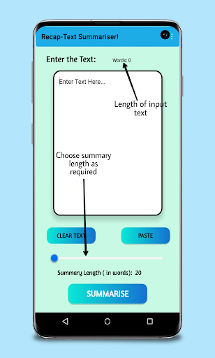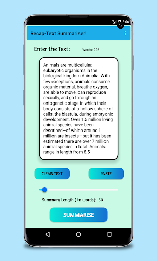 Maaari mong gamitin ang app na ito para sa layunin ng pang -edukasyon o para sa anumang opisyal na paggamit.Sa kailanman kaso ang app na ito ay nagbibigay ng magagandang resulta at lubos na kapaki -pakinabang.Gumagamit ang RECAPbumuo ng buod.Malaya kang baguhin ang haba ng buod ayon sa iyong pangangailangan.Ang RECAP ay awtomatikong bibigyan ka ng pinaka -highlight at mahalagang bahagi ng teksto.Maaari mo ring buod ang teksto ng 1000 mga salita sa 50 salita !!!>