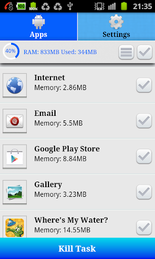 Manual Task Killing sa pamamagitan ng pagpili sa bawat indibidwal na tumatakbo app.Ipinapakita ang kasalukuyang inilalaan na memorya ng bawat app.