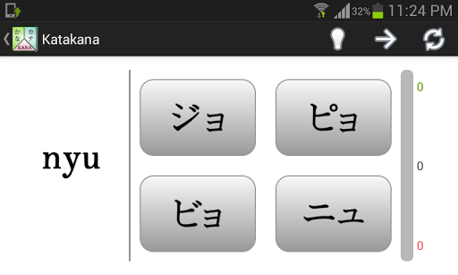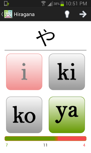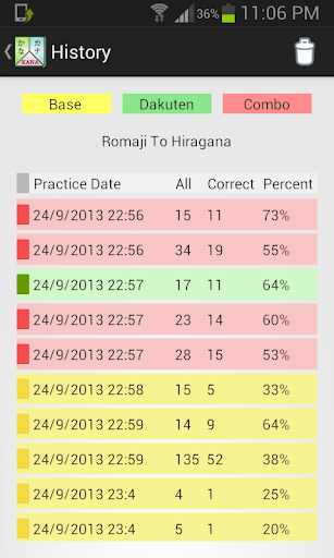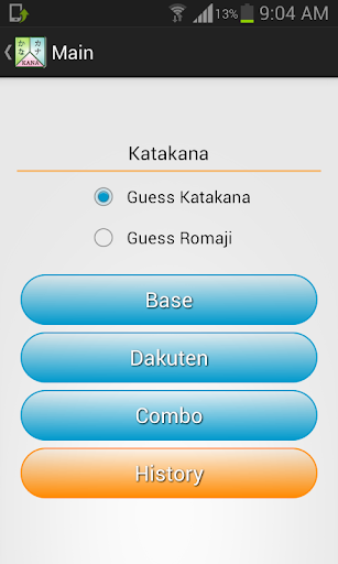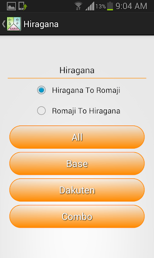 Each script is divided into three sections Base, Dakuten and Combo to make the learning process easier and smoother and you can learn each section independently. Additionally each section let you choose the right hiragana/katakana for every syllable (Romaji) or vice versa.