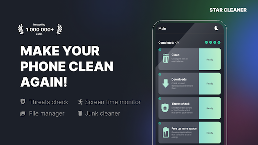 Nilikha namin ang simple at madaling gamitin na application para sa iyo upang pamahalaan ang iyong aparato ng lahat ng hindi kinakailangang data at ibalik ito sa normal na kondisyon ng paggana!Ilunsad lamang ang Star Cleaner at sa ilang minuto ay gagawing malinis at komportable ang iyong smartphone dahil tama ito pagkatapos mong bilhin ito.Suriin ang baterya.