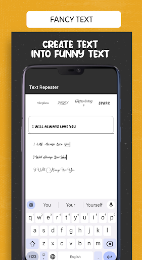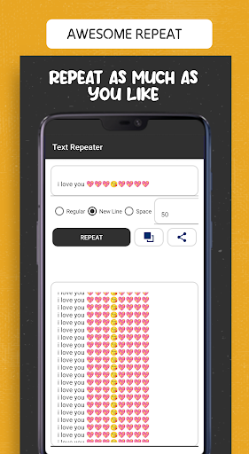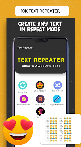 Pagod ka na ba sa paulit-ulit na kopya-pag-pasting ng parehong teksto?Sa oras na iyon, ang kailangan lang natin ay isang text repeater upang ulitin ang teksto hanggang sa 10,000 beses.Lahat tayo ay may mga sitwasyon kung saan nais nating patunayan ang ating emosyon sa pamamagitan ng paulit -ulit na pag -uulit ng isang teksto.Para sa lahat ng mga ganitong sitwasyon, ang text repeater app na ito ay isang ipinadala ng Diyos.Ano ang ginagawa nito, ulitin ang anumang teksto hangga't gusto mo.Ito ay isa sa isang uri ng pag -uulit ng mensahe, isang natatanging app ng bomba ng teksto upang magpadala ng mga mensahe nang paulit -ulit.Ang masayang bahagi ng application na ito ng Teksto ng Pag -uulit ay pinapayagan ka ring itakda ang iyong limitasyon sa pag -uulit na may bagong pag -uulit ng teksto ng linya.Maaari mong itakda ang dalas ng iyong nais na teksto at makakakuha ka ng ' paulit -ulit na teksto 'Sa seksyon ng resulta ng app na ito sa pag -uulit ng teksto.Maaari mo lamang kopyahin at i-paste ang paulit-ulit na teksto anumang oras na nais mo, maging sa anumang channel ng social media.At paulit -ulit.Ipasok lamang ang teksto na nais mong ulitin, itakda ang bilang ng mga beses na nais mo itong ulitin.Ang text repeater ay mag -aalaga ng natitira.> ✔ Emoji Repeater
