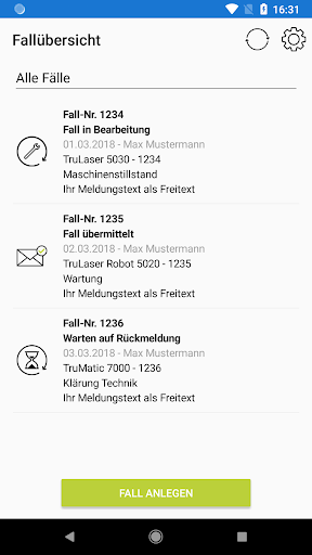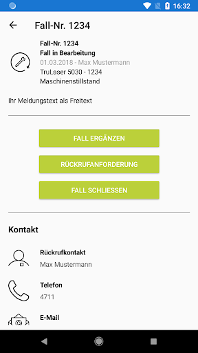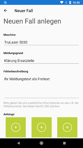 Gamit ang service app, nag -aalok ngayon ang TrumpF ng isang praktikal na alternatibo sa hotline ng serbisyo sa teknikal na customer.Hindi alintana kung ito ay isang teknikal na problema, isang ekstrang bahagi o isang katanungan tungkol sa pagpapanatili: sa limang simpleng hakbang na nilikha mo ang isang mensahe ng serbisyo.Piliin lamang ang apektadong makina at ang dahilan ng mensahe, magdagdag ng isang paglalarawan at mga larawan at pangalanan ang isang taong contact.Maaari mo nang ipadala ang mensahe sa paligid ng orasan sa TrumpF.