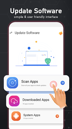 Software Update App para sa Android ay ginagamit upang matukoy kung mayroong isang app sa system na nangangailangan ng mga update mula sa tindahan . Ang pag-update ng software 2021 ay nagbibigay-daan sa gumagamit na gumamit ng tatlong pangunahing tampok kabilang ang mga apps ng pag-scan, na-download na apps, apps ng system. Ang tampok na pag-scan ng app ay nagbibigay-daan sa gumagamit na i-scan ang apps nang sabay-sabay. Pinapayagan ng tampok na na-download na apps ang gumagamit upang isa-isa piliin ang na-download na apps sa telepono at suriin ang mga update nito. Sa wakas, pinahihintulutan ng tampok na apps ng system ang user na piliin ang apps ng system sa telepono at suriin ang mga update nito.