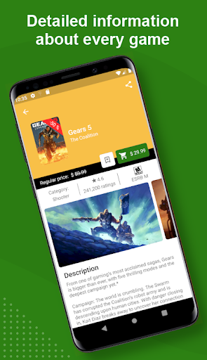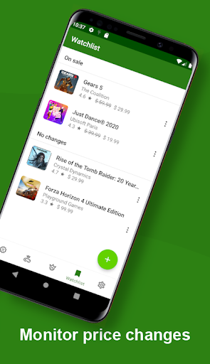 Xbox Games ay masyadong mahal. Ang app na ito ay maaaring makatulong sa iyong upang i-save ang malaking halaga ng pera - minsan kahit na 90% ng regular na presyo nito. Ang kailangan mo lang gawin ay upang mahanap ang iyong bagong paboritong laro o DLC at idagdag ito sa watchlist. Sa sandaling ang iyong item ay sa pagbebenta o ang presyo nito ay bumaba; Ikaw ay aabisuhan.