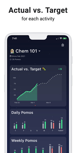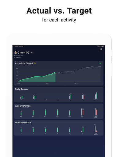 may milki, maaari kang magtakda ng mga variable na pang-araw-araw na pag-aaral para sa bawat aktibidad at subaybayan laban sa kanila sa isang tinukoy na panahon hal. 2 linggo o 2 buwan. Ang aktwal na kumpara sa target (worm) chart ay hindi mapaniniwalaan o kapani-paniwala malakas sa pagpapanatili sa iyo sa track sa iyong mga layunin, maaari mong biswal na subaybayan ang iyong pagganap sa panahon. Walang ibang pag-aaral ng timer app ang ginagawa nito, kaya kailangan kong lumikha ng isa na haha.