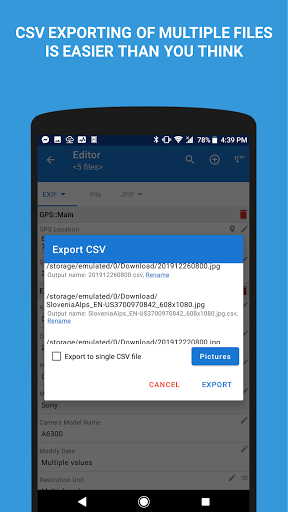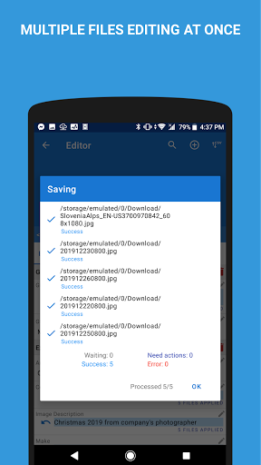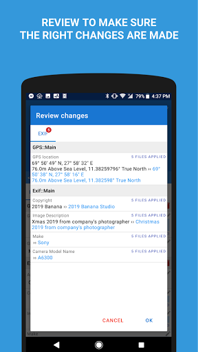 Exif Pro - Exiftool para sa Android ay isang tool na nagpapalawak ng kakayahan ng Exiftool ni Phil Harvey sa Android platform. Sinusuportahan nito ang pag-edit ng maramihang mga file nang sabay-sabay.