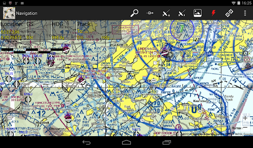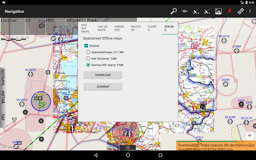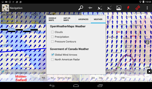 There is a wide choice of map overlays available, You can use just the standard google map types or for the US the complete bundle of all the available AAF aviation map types is available. Furthermore we have around the world basic coverrage of airspaces overlays available. Also some weather overlay options are available, like wind arrows, pressurelines, clouds and North-American weather radar. For airspaces and AAF map overlays there is a cache mechanism which stores the images on your device for max 14 days for offline viewing.