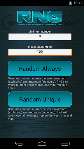 Application generates random numbers. All you need to do is to set minimum and maximum value and you can start generate numbers.