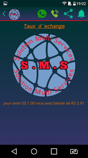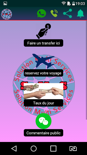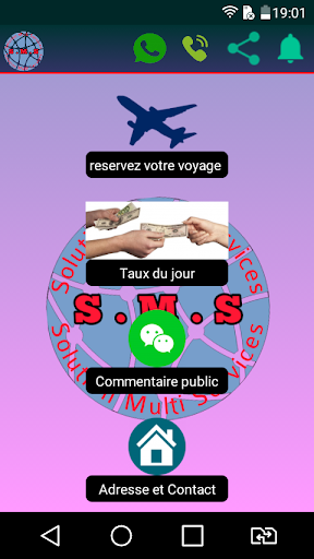 Cet application permet de beneficier tous les services offerts par Solution Multi Services (S.M.S), grâce à cet application vous pouvez desormais placer vos commandes en ligne en remplissant les formulaires disponible correspondant à votre demande,par exemple vous pouvez envoyer de l`argent en ligne par Unitransfer ou CAM transfer, mais vous pour valider votre demande vous devez passer à la caisse pour payer ou deposez l`argent sur notre compte bancaire puis envoyez le reçu que la banque vous a fournie, afin de bien vouloir valider votre transaction, grâce à cet application vous pouvez verifier le taux du jour, merci del`navoir installer sur vos apareils, cordialement Solution Multi Services.
