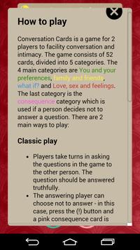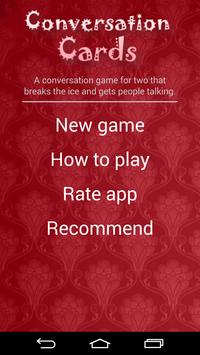 The game is played by two people who take turns in asking questions from a deck of cards in the game. Conversation cards are useful for dates, for friends, for getting to know your partner or for ice-breaking games.